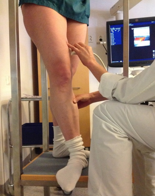 - Ultraäänitutkimus tehdään potilaan seistessä siten, että hänen painopisteensä on ei-tutkittavalla jalalla. Laskimovirtaus ylöspäin provosoidaan mansetilla tai manuaalisesti. Nopealla pohjelihaksen puristuksella ja vapautuksella voidaan todeta mahdollinen refluksi eli takaisinvirtaus tarkasteltavassa laskimossa. Refluksin saamiseksi esiin voidaan reiden yläosan ja lantion laskimoissa käyttää myös Valsalvan menetelmää «Cavezzi A, Labropoulost N, Partscht H, ym. [Duplex...»25.