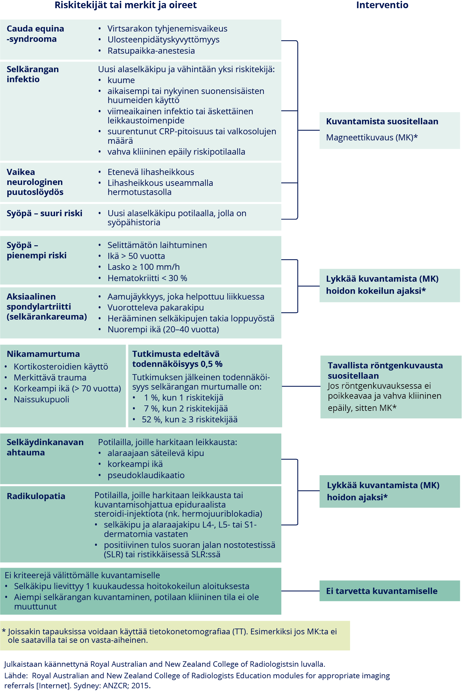 - Kuvantamista tulee välttää, jos vakavaan syyhyn viittaavia merkkejä ei ole, ja sen vähäisestä merkityksestä alaselkäkivun diagnosoimisessa ja hoidon suunnittelussa tulee keskustella potilaan kanssa.