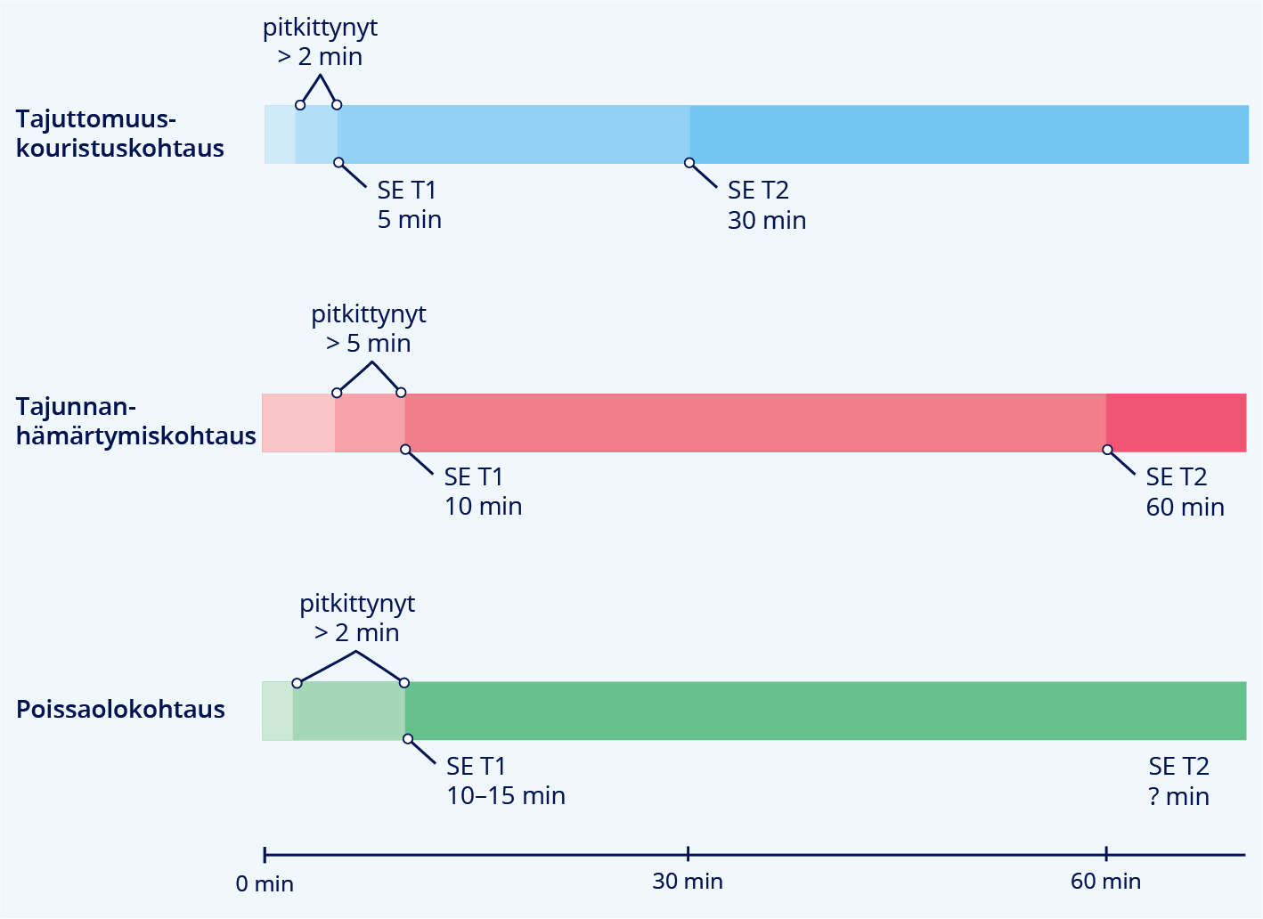 Epileptisten kohtausten aikarajat pitkittyneelle kohtaukselle ja status epilepticukselle (SE) ja status epilepticuksen T1- ja T2-aikarajat.