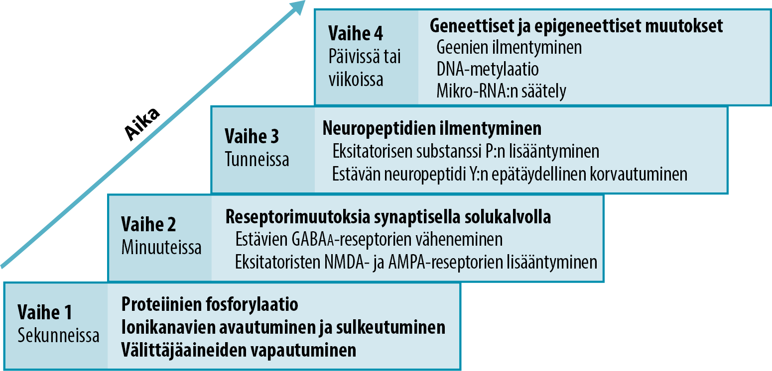 - Seuraavien minuuttien aikana alkaa esiintyä reseptoritason muutoksia: synaptisen solukalvon ärtymistä estävät, jarruttavat eli inhibitoriset gamma-aminovoihappovälitteiset reseptorit (GABA) vähenevät ja kiihdyttävät eli eksitatoriset glutamaattivälitteiset reseptorit (NMDA, AMPA) lisääntyvät «Walker MC. Pathophysiology of status epilepticus. ...»11.