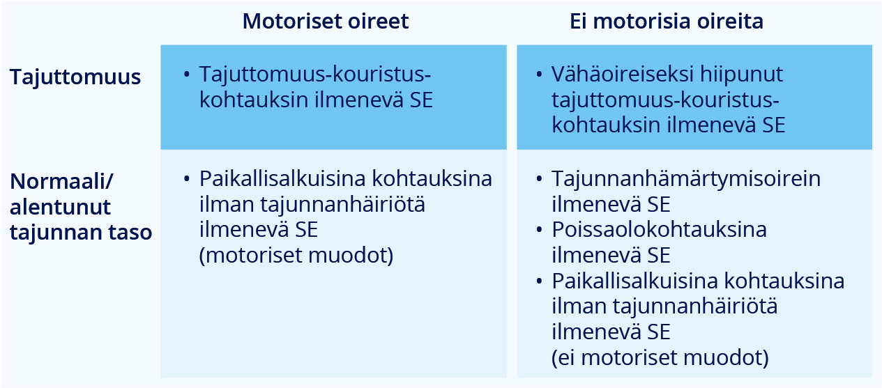 - Status epilepticus luokitellaan kohtausten kliinisen ilmiasun (tajunnan taso, motoriset