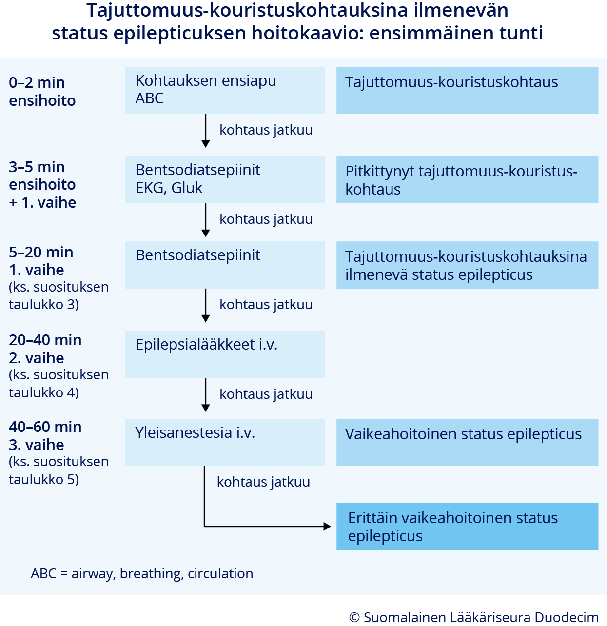 - Kyseessä on status epilepticus, kun tajuttomuus-kouristuskohtaus on kestänyt yli 5 minuuttia ja tajunnanhämärtymiskohtaus ja poissaolokohtaus yli 10 minuuttia.