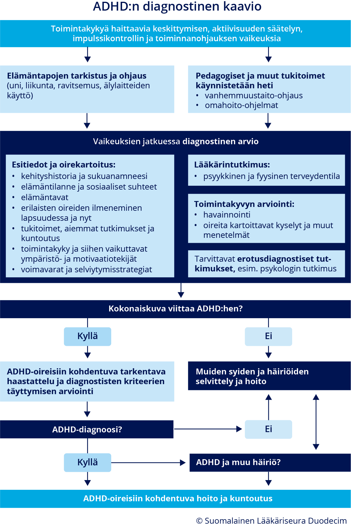 - Diagnostiseen arvioon tarvitaan tietoa oireiden esiintymisestä ja toimintakyvystä eri tilanteissa nyt ja aiemmin, henkilön psyykkisestä ja fyysisestä terveydentilasta, kehityshistoriasta, elämäntilanteesta sekä muista oireisiin vaikuttavista tekijöistä. Ks. video ADHD:n diagnosointi vaatii huolellisen arvion «ADHD:n diagnosointi vaatii huolellisen arvion (video)»3.
