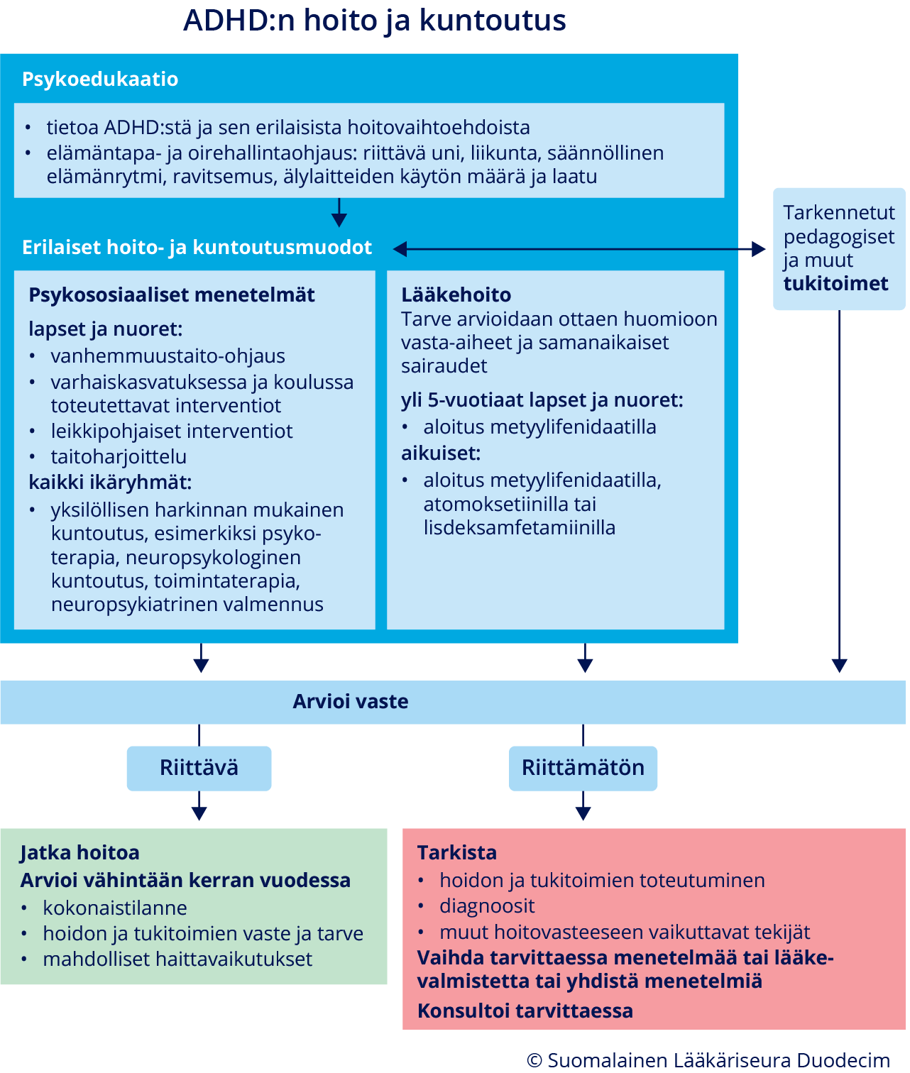 - Samanaikaisten häiriöiden hoito yhdistetään ADHD-oireiden hoitoon.