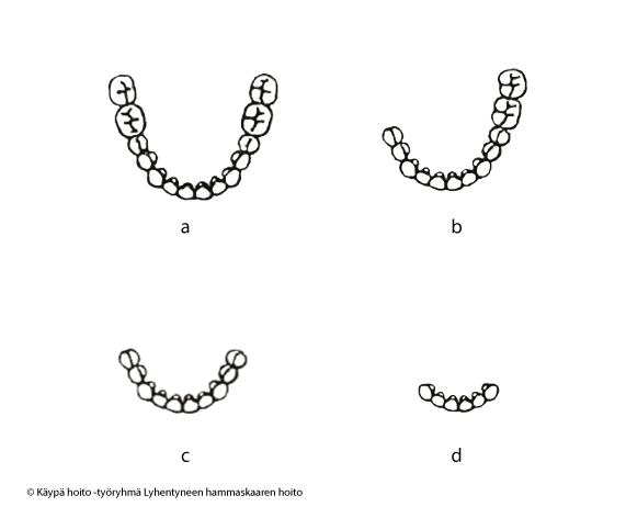- Jos jäljellä on vain hampaat kulmahampaasta kulmahampaaseen tai vähemmän, käytetään termiä voimakkaasti lyhentynyt hammaskaari «Käyser AF. Shortened dental arches and oral functi...»6 (ks. kuva «Hammaskaarten luokittelu puuttuvien hampaiden perusteella»1).