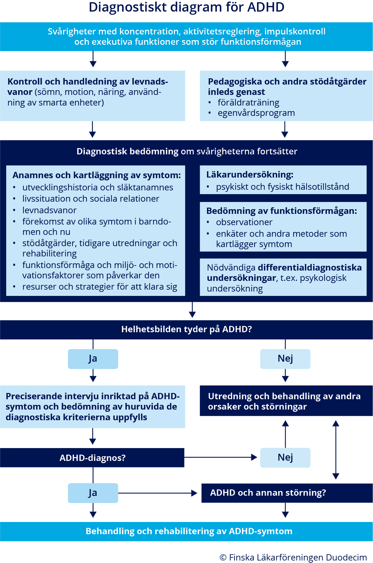 - För den diagnostiska bedömningen behövs information om när symtomen förekommer och hurdan funktionsförmågan är i olika situationer i nuläget och hur det har varit tidigare. Dessutom behövs information om personens psykiska och fysiska hälsotillstånd, utvecklingshistoria, livssituation och andra faktorer som påverkar symtomen. Se video om att det krävs en noggrann bedömning för att diagnostisera ADHD «ADHD:n diagnosointi vaatii huolellisen arvion (video)»3.