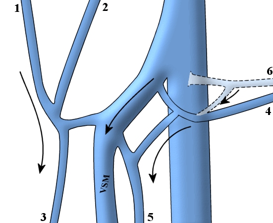 Alaraajalaskimoiden vajaatoiminta. Nivustaipeesta alkava laaja-alainen magnasysteemin vajaatoiminta, jonka hoidossa perinteinen nivusleikkaus ei riitä. VF=vena femoralis, VSM=vena saphena magna: 1. Vena circumflexa iliaca superficialis, 2. Vena epigastrica superficialis, 3. Anterolateraalinen sivuhaara, 4. Vena pudendalis externa superficialis, 5. Posteromediaalinen sivuhaara, 6. Vena pudendalis externa profunda