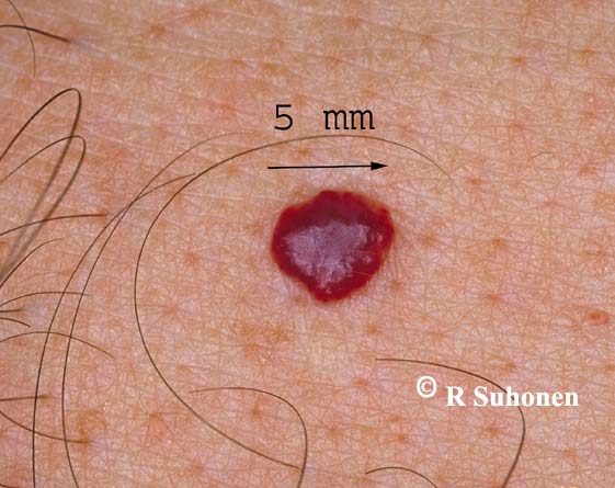 Kirsikkaluomi. Kirsikkaluomi on vartalolla keski-iästä eteenpäin esiintyvä, yleensä muutaman mm. kokoinen, sileä, kirsikanpunainen, hyvänlaatuinen verisuonimuodostelma, joita voi olla lukuisiakin. Hoitoperuste on vain esteettinen.