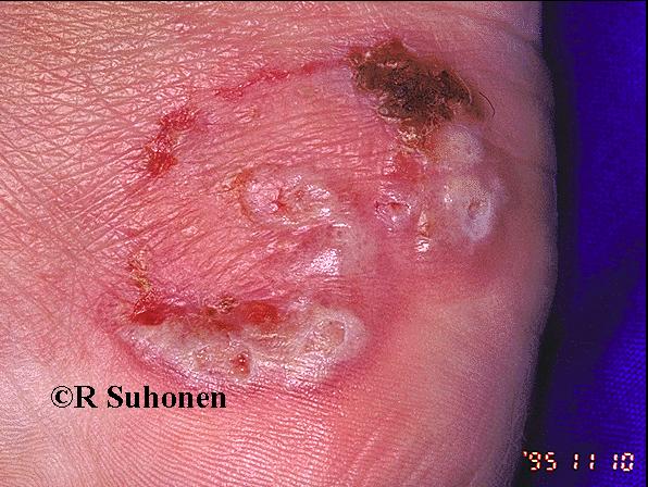 Silsa alaraajan iholla. Nilkan etupuolen Trichophyton mentagrophytes infektio samalla potilaalla kuin kuvassa «Märkärakkulainen silsa alaraajan iholla»1