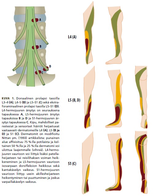 Dermatomikartta välilevytyrän aiheuttamasta hermojuuriärsytyksestä eri tasoilla. Kuvan lähde