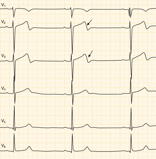 Urheilijan EKG: varhainen repolarisaatio ja T-aallon poikkeava muoto. Varhainen repolarisaatio ja T-aallon poikkeava muoto kytkennöissä V2 ja V3 (nuolet) 21-vuotiaalla suunnistajalla. Lisäksi vasemman kammion hypertrofian volttikriteerit täyttyvät; SV2+RV5 on 52 mm.