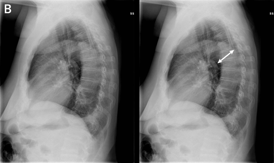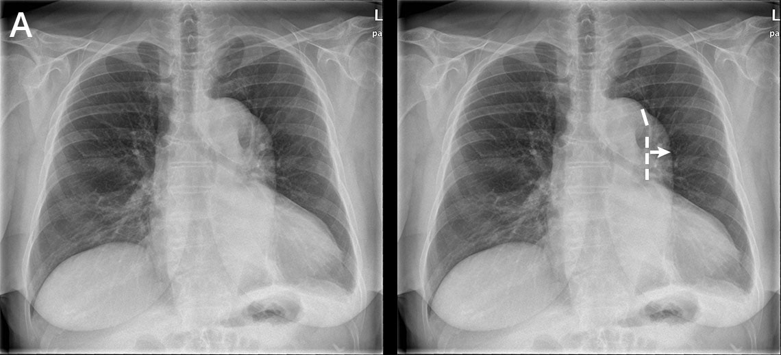 A. AP-kuvassa on nähtävissä leventynyt välikarsina. Potilaalla oli B-tyypin aortan dissekoituma. Vasemmalla hieman pleuranestettä.