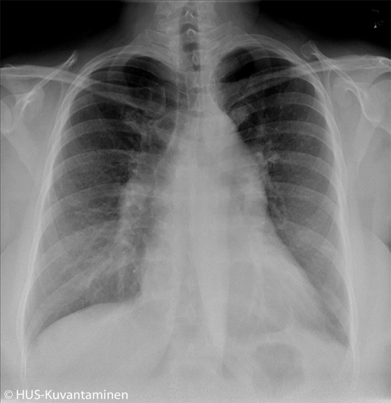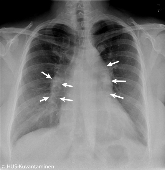 Keuhkokuvassa näkyvät kohonneeseen keuhkoverenpaineeseen sopivat löydökset. Lisäksi keuhkovaltimot ovat prominentit (nuolten väliin jäävä alue).
