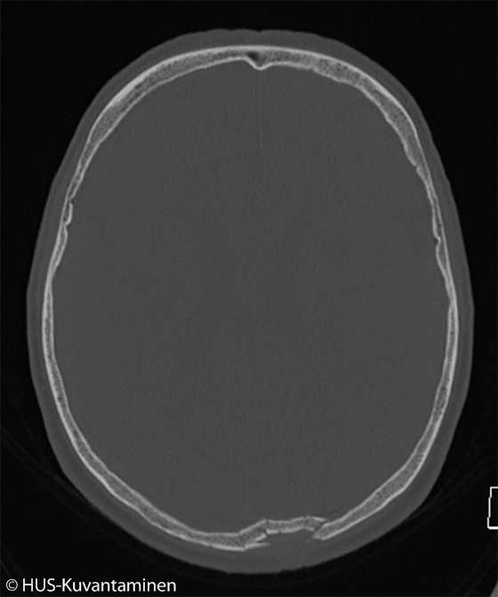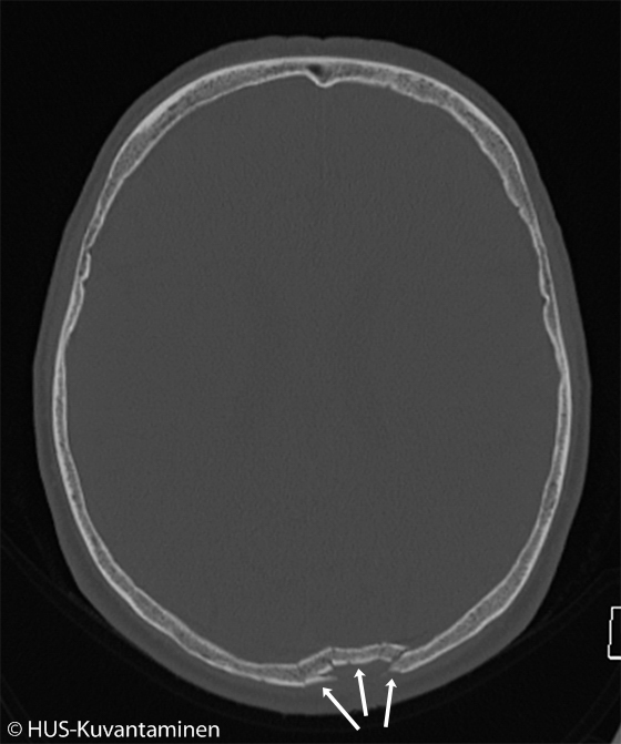 Kallonmurtuma pään TT-kuvassa (kuva 1 löydösmerkinnöin),