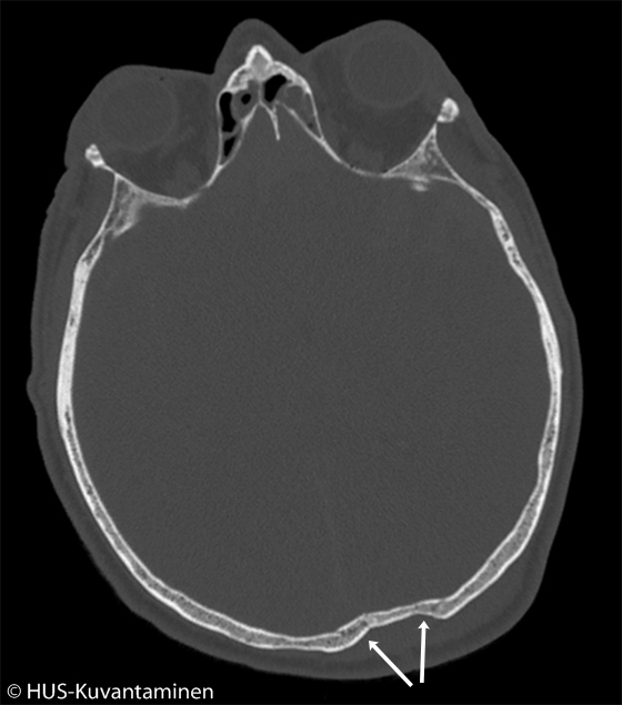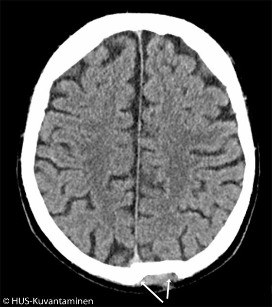 Luuikkunalla otetussa pään TT:ssä näkyy impressiomurtuma (nuolet) takana parietaaliluussa, mutta potilaalla ei todettu aivovauriota (ks. myös kuva «Kallonmurtuma pään TT-kuvassa»1