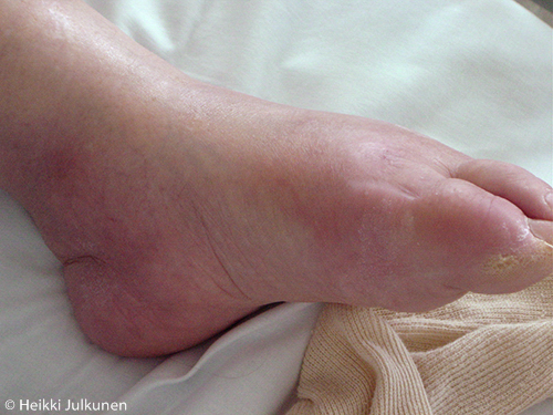 Akuutti kihti isovarpaan tyvinivelessä. Nivel ja sen ympäristö on turvonnut, punoittaa ja kuumoittaa.