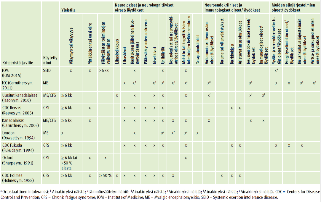 | CDC/Fukuda = Centers for Disease Control / Fukudan kriteeristö «Fukuda K, Straus SE, Hickie I ym. The chronic fati...»3, CCC = Canadian Consensus Criteria «Carruthers B, Jain A, De Meirleir K ym. Myalgic en...»4, IOM = Institute of Medicine «Institute of Medicine of the National Academies. B...»7 | ||