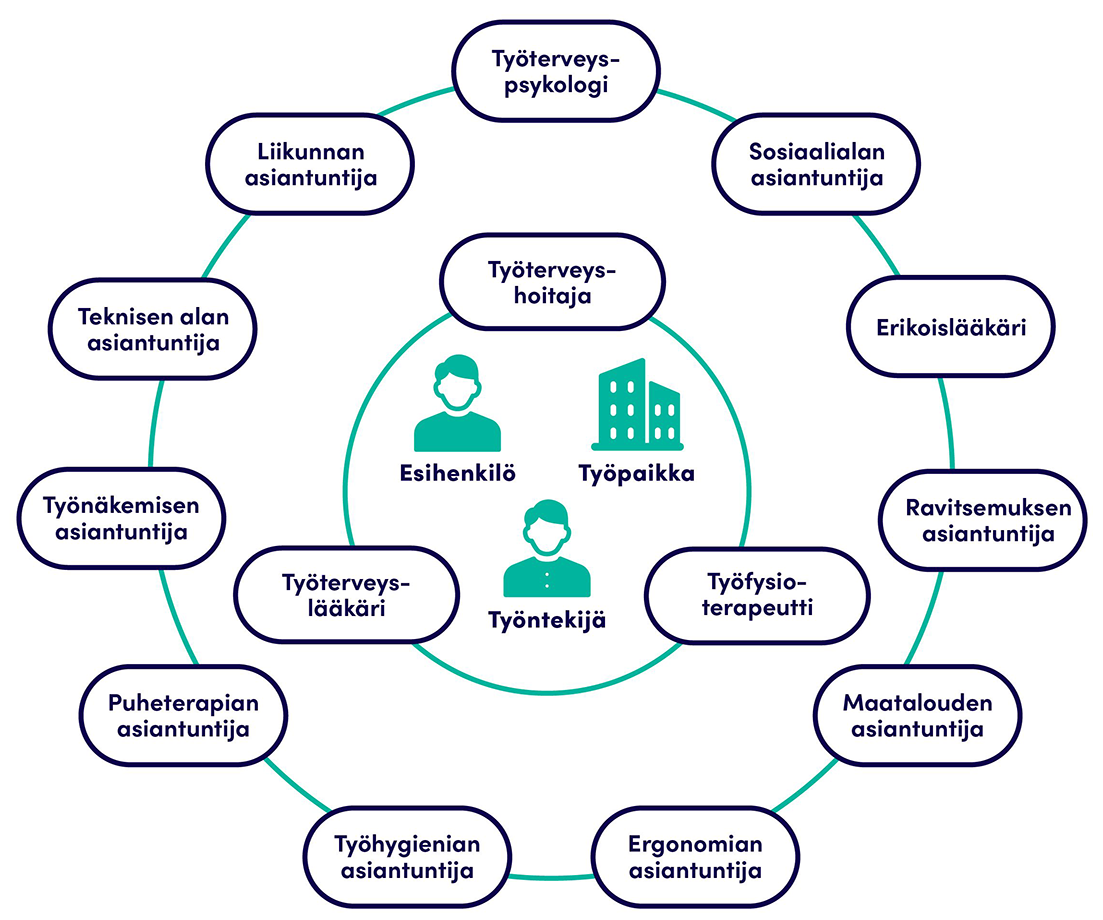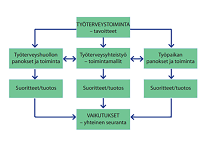 Tavoitteellinen työpaikan ja työterveyshuollon toimijoiden yhteistyö työturvallisuuden, terveyden ja työkyvyn edistämiseen tähtäävänä toimintana luo mahdollisuuden työntekijöiden parempaan terveyteen ja työkykyyn «Viljamaa M, Uitti J, Juvonen-Posti P ym. Työtervey...»7. Useat työterveysongelmat ratkaistaan työpaikan sisäisenä lähiesihenkilö- ja työsuojelutoimintana. Työterveyshuolto toimii asiantuntijana terveydellisen merkityksen arvioinnissa.
