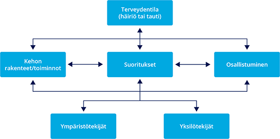 ICF (International Classification of Functioning, Disability and Health) -toimintakykyluokituksen osa-alueiden vuorovaikutussuhteet.