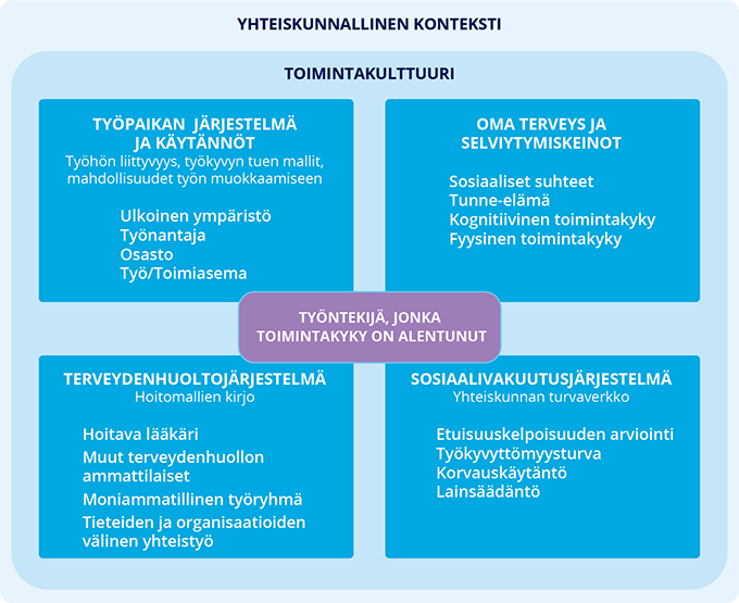 Työkykyisyyteen vaikuttavat monet yksilön, työpaikan, terveydenhuollon, kuntoutuksen ja yhteiskunnan tekijät, mitä on kuvattu työkyvyttömyyden areenana (kuva « Työkyvyttömyyteen vaikuttavat tekijät (työkyvyttömyyden areena) »5).