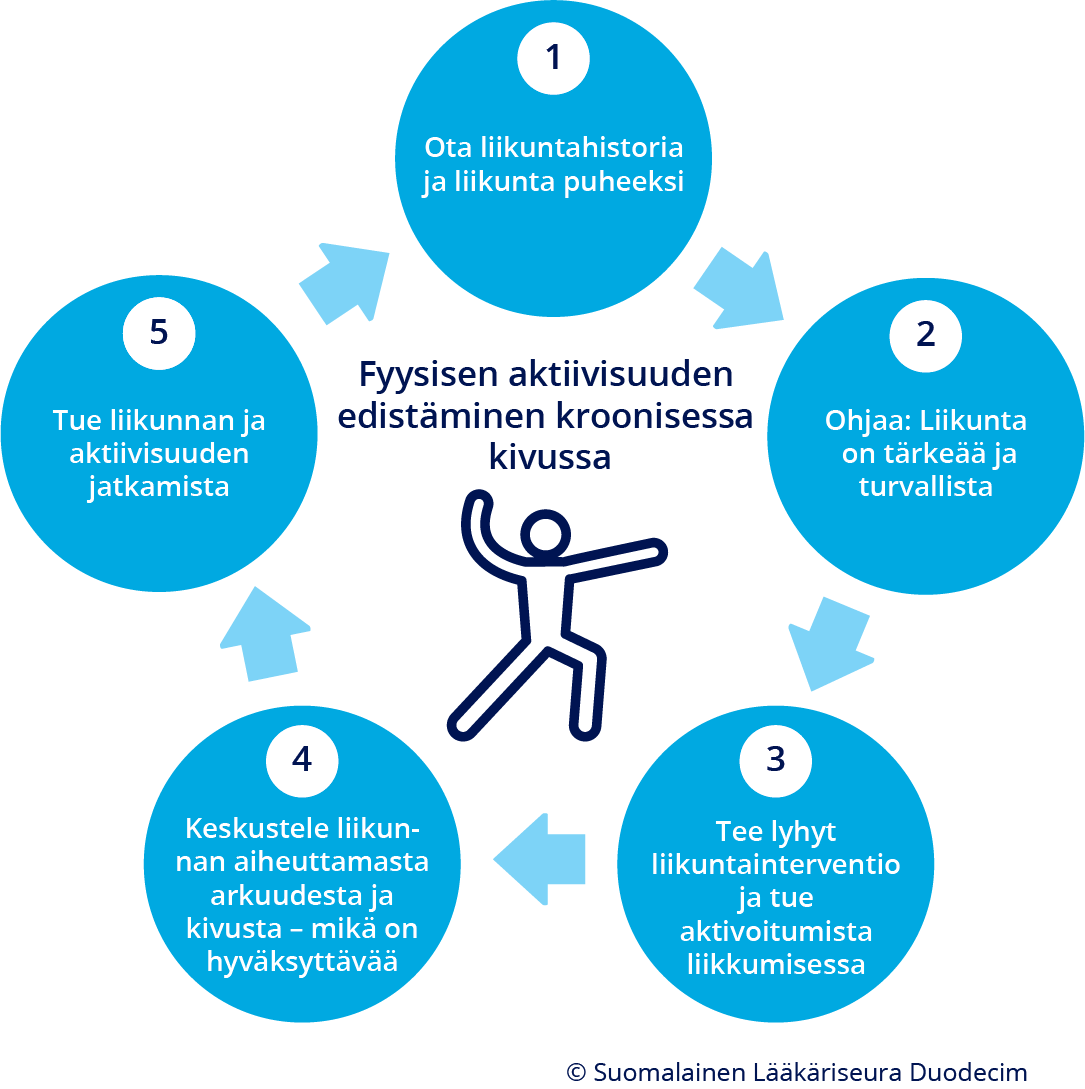 - Informoi, että liikunta on tärkeää ja turvallista henkilöille, joilla on kroonista