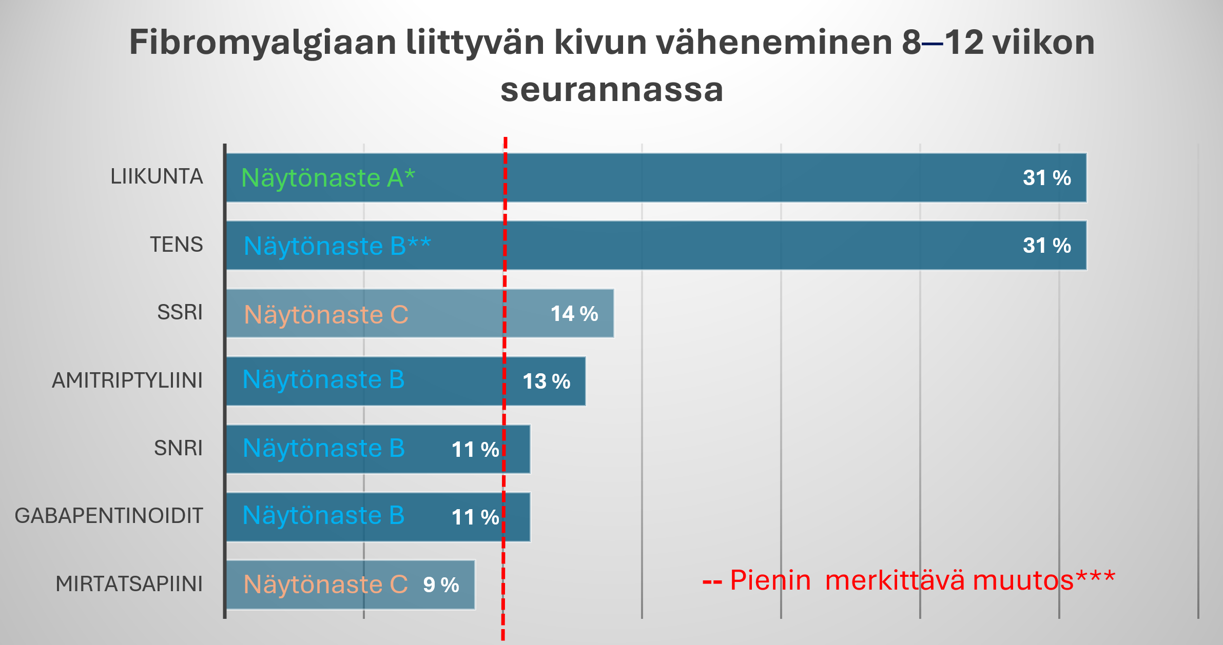 *** Raja-arvon kuvaa käypä hoito -suosituksessa käytettyä pienimmän merkittävän muutoksen raja-arvoa. Tutkimusten mukaan potilas tunnistaa muutoksen voinnissaan, kun hyöty ylittää 15 %. Alle 15 % hyöty ei siis ole enää todennäköisesti potilaan havaittavissa.