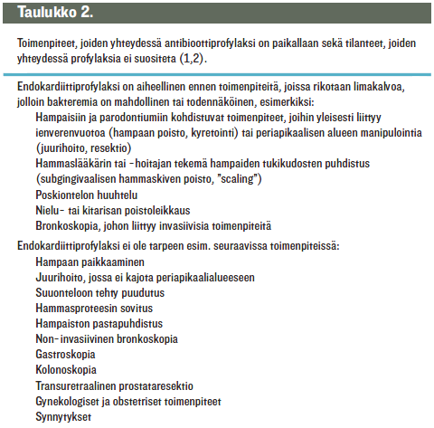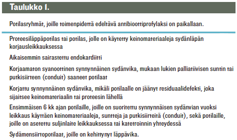 Suomessa tulisi noudattaa yhdysvaltalaisia suosituksia. Duodecimin Terveysporttiin päivitys on myös tehty. Taulukossa «Potilasryhmät, joille toimenpidettä edeltävä antib»1 on lueteltu ne potilasryhmät, joille profylaksi on tarpeen. Rakenteellista sydänvikaa sairastavien antibioottiprofylaksisuosituksia on selvästi tiukennettu. Korjaamatonta rakenteellista sydänvikaa sairastaville suositellaan antibioottiprofylaksia ainoastaan, jos vika aiheuttaa syanoottisuutta. Niinpä esimerkiksi korjaamaton kammioväliseinän aukko (VSD) ei enää tarvitse antibioottiprofylaksia. Ellei sydänleikkauksessa ole käytetty keinomateriaalia, ei profylaksia enää suositella.