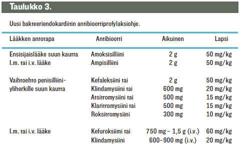 Yhdysvaltojen sydänyhdistys (AHA) on jälleen päivittänyt endokardiittiprofylaksiohjeita (1), samoin kuin Britannian NHS (2). Bakteeriendokardiitin ilmaantuvuudeksi arvioidaan väestöstä riippuen 2-6 tapausta 100 000 henkilövuotta kohden, ja miehet sairastuvat naisia useammin (3). Uusien suositusten taustalla on muuttunut käsitys endokardiitin synnystä sekä lääkkeellisen ehkäisyn hyödystä ja riskeistä. Spontaanit päivittäiset bakteremiat ovat paljon tavallisempi syy endokardiitin syntyyn kuin hammaslääketieteelliset tai lääketieteelliset toimet. Tutkimukset osoittavat, että antibioottiprofylaksi vähentää endokardiitin riskiä minimaalisesti, jos ollenkaan (4). Antibiooteista koituvat haitat, kuten anafylaktisen reaktion riski ja resistenttien bakteerikantojen synty, aiheuttavat endokardiittia suuremman vaaran, jos antibiootteja annetaan myös pienen riskin potilaille pienten riskien toimenpiteissä. Uusissa ohjeissa painottuu entisestään hyvä suun ja hampaiden hygienia ja hoito. Lisäksi suosituksen piiriin on otettu ei vain suurimmassa endokardiitin riskissä olevia vaan myös niitä, joille endokardiitin seuraukset olisivat vakavimmat (kuten sydämensiirron saaneet potilaat).