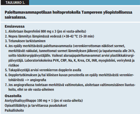 Loimme vuonna 2010 Tampereen yliopistollisessa sairaalassa uuden paleltumavammapotilaiden hoitoprotokollan (taulukko 1 «»1). Alkuvaiheen hoitona tähän kuuluvat nopeasti aloitettu ibuprofeeni, nopea lämmitys paikassa, jossa ei enää ole riskiä uudesta paleltumavammasta ja verenkierron arviointi alkuvaiheen lämmityksen jälkeen kliinisesti sekä dopplerlaitteen avulla. Tunnottomat, kalpeat alueet, veriset rakkulat ja puuttuva dopplersignaali viittaavat vaikeaan paleltumavammaan ja näille potilaille järjestetään kiireellinen angiografiatutkimus, mikäli liuotushoidon vasta-aiheita ei ole. Liuotushoito aloitetaan, jos angiografiassa todetaan selvä valtimotukos tai distaalisten valtimoiden huono täyttyminen. Liuotushoidon ajan potilasta seurataan tarkkailuosastolla. Potilaille aloitetaan osastolla ibuprofeiinin lisäksi asetyylisalisyylihappolääkitys. Kivunhoitona käytetään tarvittaessa opiaattilääkitystä ja puudutuksia. Ensimmäisenä talvena kaksi edellä kuvattua potilasta saivat valtimonsisäisen liotushoidon. Molemmat potilaat selvisivät ilman amputaatioita tai kirurgista hoitoa. Kliinisen kokemuksemme perusteella uskomme, että ilman liuotushoitoa molemmat potilaat olisivat tarvinneet amputaatioita.