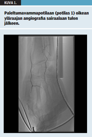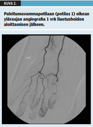 Potilas 1 on 49-vuotias päihdeongelmainen mies. Aikaisempina sairauksina hänellä on ollut mahalaukun ja ruokatorven tulehdus. Potilas löydettiin päihtyneenä lumihangesta makaamasta. Ensiavussa tärykalvosta mitattu ruumiinlämpö oli 31 °C. Ulkoisia vammoja potilaalla ei todettu. Potilasta lämmitettiin kehonulkoisin lämpöpeittein, ja kestokatetrin kautta mitattu lämpötila nousi nopeasti yli 35 °C:een. Kliinisessä tutkimuksessa kädet olivat kalpeat ja verenkierrottoman oloiset lämmityksen jälkeen. Kummastakaan kädestä ei saatu dopplerlaitteella mitattua valtimoverenkiertosignaalia rannetasolta tai sormista. Potilaalle tehtiin paleltumavammapotilaan protokollan (taulukko 1 «»1) mukaisesti yläraajojen verisuonten varjoainetutkimus (angiografia). Molempien yläraajojen värttinä- ja kyynärvaltimot täyttyivät erittäin hitaasti, eivätkä sormivaltimot eivät täyttyneet luotettavasti (kuva 1 «»2). Potilaalle annettiin protokollan (taulukko 2 «»3) mukainen valtimon sisäinen liuotushoito, jota jatkettiin kahden vuorokauden ajan. Lisäksi potilaalle aloitettiin asetyylisalisyylihappo- ja ibuprofeiinilääkitys. Vuorokauden kuluttua tehdyssä kontrollivarjoainekuvauksessa verenkierto oli parantunut (kuva 2 «»4). Liuotushoidon päättymisen jälkeen käsien verenkierto oli kliinisesti hyvä ja Allenin testillä arvioiden molempien rannevaltimoiden verenkierto oli normalisoitunut. Potilas kotiutui 5 vrk:n sairaalahoidon jälkeen. 6 viikon kuluttua paleltumavammasta potilaan käsissä oli vielä tunnon alentumaa ja kylmäherkkyyttä. Amputaatioita tai leikkaushoitoa ei tarvittu.