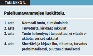 Vaikeusasteeltaan paleltumavammat jaetaan neljään luokkaan (taulukko 3 «»5). Alkuvaiheessa paleltumavamman syvyyden arvioiminen luotettavasti on kuitenkin vaikeaa. Lämmityksen jälkeenkin jatkuva tunnottomuus, dopplersignaalin puuttuminen ja veriset rakkulat ovat huonon ennusteen merkkejä (9). Alkuvaiheessa kuvantamistutkimuksista ei ole apua paleltumavamman syvyyden ja laajuuden arvioinnissa. Tutkimuksissa on pystytty tarkasti osoittamaan tulevan amputaatiolinjan sijainti 8 vuorokauden kuluttua paleltumasta tehdyllä luuisotooppikuvauksella (10). Kliinisen tutkimuksen (ihon väri, vitaalireaktio, tunto, rakkulat, pulssien palpointi) lisäksi ääreisosien verenkiertoa voidaan arvioida yksinkertaisella dopplertutkimuksella. Invasiivisista tutkimuksista verenkierron tilannetta raajassa voidaan kuvantaa angiografialla.