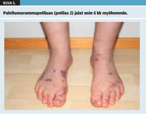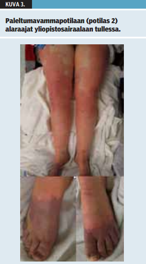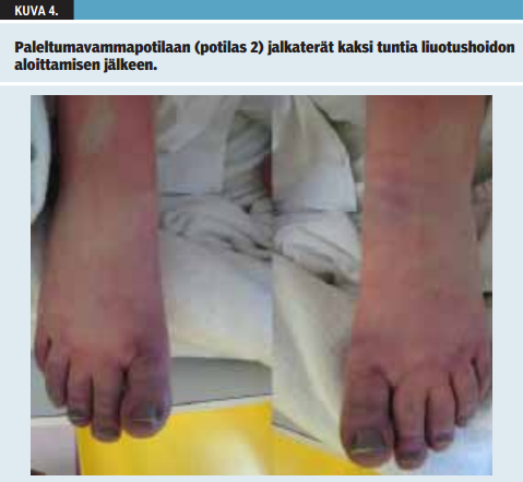 Potilas 2 on 37-vuotias nainen, jolla ei ole merkittäviä pitkäaikaissairauksia. Potilas oli harhaillut ulkona yli 20 °C:n pakkasessa noin neljän tunnin ajan ohuissa vaatteissa. Ambulanssin saapuessa kohteeseen potilaan tärykalvolämpötila oli 33,7 °C. Alaraajat olivat tunnottomat polvista alaspäin. Nilkoissa tai varpaissa ei ollut aktiivista liikettä. Säären tai jalkaterän iholla distaalisesti ei ollut vitaalireaktiota. Potilas kuljetettiin keskussairaalaan ja puhelinkonsultaation perusteella potilas siirrettiin yliopistosairaalaan liuotushoitoarvioon. Tulovaiheessa potilaan yleistila oli hyvä ja potilas oli normaalilämpöinen. Polvista distaalisesti potilas ei pystynyt selvästi paikallistamaan kosketusta. Valtimosignaali oli kuultavissa dopplerlaitteella nilkkatasolla arteria tibialis posteriorista ja arteria dorsalis pediksestä, mutta ei distaalisemmista digitaaliarterioista. Polvissa ja nilkoissa oli vain vähän aktiivista liikettä. Jalkaterät olivat sinertävät ja säärissä oli vaaleita alueita, joissa ei ollut vitaalireaktiota (kuva 3 «»6). Vasemmassa kädessä ei ollut dopplersignaalia I-II digitaaliarterioissa ja arteria ulnariksessa. Oikeassa kädessä ei todettu kliinisessä tutkimuksessa verenkiertovajetta. Kuusi tuntia kylmäaltistuksen päättymisen jälkeen tehdyssä angiografiassa vasemman käden arcus oli spastinen ja kaikki digitaaliarteriat eivät täyttyneet. Alaraajoissa valtimorungot olivat avoimet malleolitasolle asti, mutta varjoainetäyttö digitaaliarterioihin oli heikkoa. Vasempaan yläraajaan potilas sai 4 mg:n kerta-annoksen alteplaasia ja molempiin alaraajoihin kerta-annoksen ohella protokollan mukaisen jatkuvan liuotushoidon kahden vuorokauden ajan. Jo kaksi tuntia liuotushoidon aloituksesta jalkaterien väri ja vitaalireaktio olivat parantuneet selvästi (kuva 4 «»7). Lisäksi potilaalle aloitettiin asetyylisalisyylihappo- ja ibuprofeiinilääkitys. Alaraajoissa oli alkuvaiheessa hankalaa turvotusta. Ensimmäisen kahden vuorokauden aikana potilaan munuaisarvot nousivat, mutta asetyylisalisyylihapon ja ibuprofeiinin tauotus sekä tehostettu nestehoito riittivät korjaamaan tilanteen. Noin kaksi viikkoa paleltumavamman jälkeen tehdyssä valtimoverenkierron gammakuvauksessa hitain valtimoverenkierto todettiin oikean käden sormissa, vaikka oikean yläraajan paleltumavamma oli kliinisesti lievin. Potilas kotiutui 16 vuorokauden sairaalahoidon jälkeen ja hän toipui vaikeasta paleltumavammasta hyvin ilman amputaatioita tai leikkaushoitoa. Potilas palasi työelämään kolmen kuukauden sairausloman jälkeen (kuva 5 «»8).
