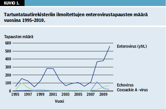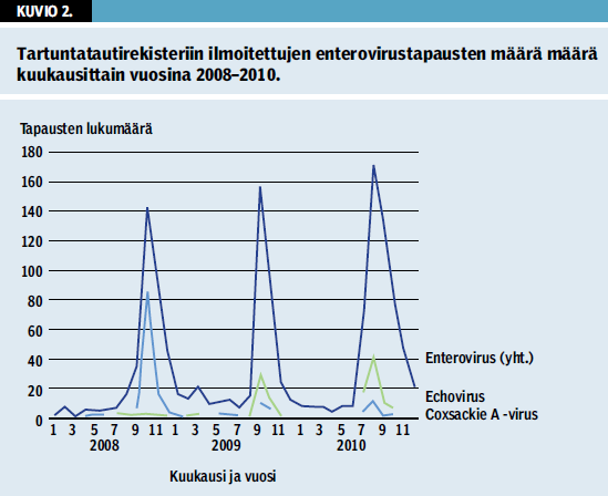 Vuonna 2008 coxsackie A -viruksen tapausmäärät lisääntyivät ja tätä seurasi vuosina 2009–2010 echovirustapausmäärien kasvu (kuvio 1 «»2). Tartuntatautirekisteriin ilmoitettiin vuonna 2010 yhteensä 560 enterovirustapausta (taulukko «»1), enterovirustapauksia todettiin eniten heinäkuun puolivälissä (kuvio 2 «»3).