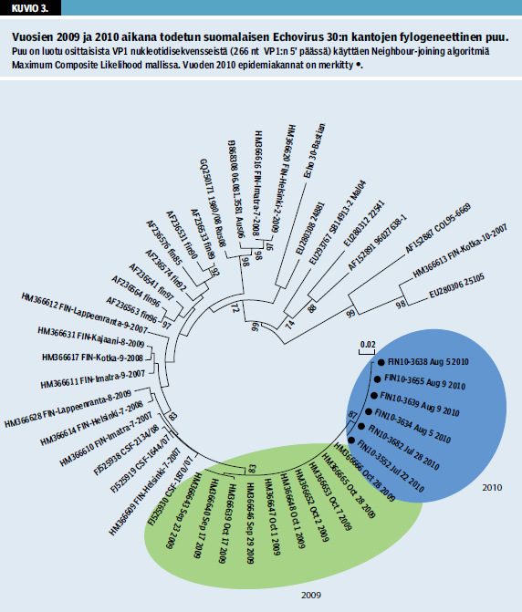 Kaikkiaan jatkotutkimuksiin lähetettiin 25 % (99/395) näytteistä. Niistä 75 % (74/99) oli echoviruksia, 19 % (19/99) coxsackie A -viruksia ja 6 % (6/99) coxsackie B -viruksia. Kaikki tyypitetyt echovirukset osoittautuivat echovirus 30:ksi. Echovirustapauksista 82 % oli alle 20-vuotiaita ja 55 % oli miehiä; kaikki tartunnat todettiin heinäkuun puolivälin jälkeen. Suurin ilmaantuvuus todettiin Pohjois-Karjalan (8,8/100 000) ja Kanta-Hämeen (6,9/100 000) sairaanhoitopiireissä. Vuoden 2010 echovirus 30 muistutti perimältään läheisesti vuoden 2009 epidemiavirusta (kuvio 3). Seitsemän (33 %) sairaanhoitopiiriä raportoi suurehkoja echovirusepidemioita: epidemiat alkoivat Keski-Suomesta ja levisivät sitten länteen ja itään.