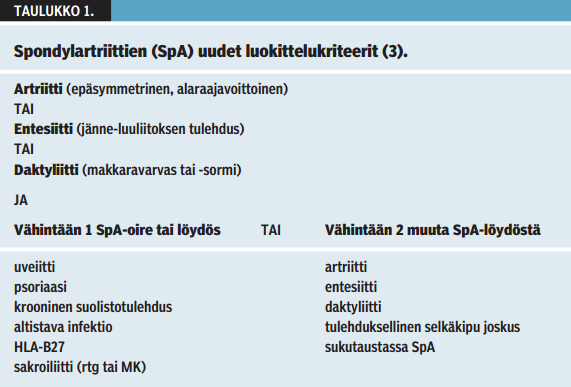 Kansainvälinen reumatologiverkoston EULAR:n alaisuudessa toimiva ASAS (Assessment of SpondyloArthritis International Society; www.ASAS.org) on laatinut uudet spondylartriittien kriteerit (taulukko 1), joiden tarkoitus on auttaa löytämään diagnoosi epäselvästi oireileville potilaille ja tämän ansiosta nopeuttaa hoidon aloitusta. Kriteerien herkkyys- ja spesifisyyslukemiksi saatiin 78 % ja 82 %, mikä on selvä parannus aikaisempien kriteereihin nähden (3).