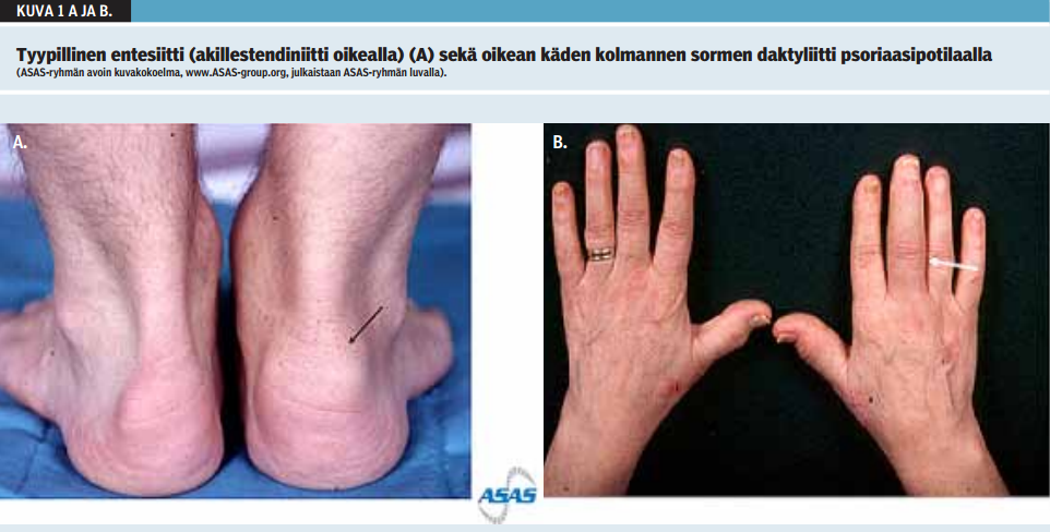 Spondylartriiteilla on monia yhteisiä kliinisiä ilmenemiä ja tyypillisesti myös geneettinen yhteys HLA-B27-kudostyyppiin (tutkimuksessa 47 %:lla) (3) ja usein positiivinen sukutausta. Spondylartriitin kliiniseen kuvaan kuuluu artriitin lisäksi (tutkimuksessa 85 %:lla) (3) perifeeristen nivelten ja selän, nivelsiteiden ja luuston tulehdus (tulehduksellinen selkäkipu, sakroiliitti, spondyliitti, spondylodiskiitti), jotka aiheuttavat luun destruktiota ja uudisluunmuodostusta (9), entesiitit (tutkimuksessa 57 %:lla) (3) (kuva 1A «»2) ja daktyliittejä (kuva 1B «»2). Perifeeristen nivelten tulehdukset ovat tyypillisesti epäsymmetrisesti esiintyviä ja useimmiten alaraajoissa. Tyypillisiä ovat myös nivelten ulkoiset ilmentymät, kuten iriitit (tutkimuksessa 4 %:lla) (3) ja eräät ihottumat, erityisesti psoriaasi ja pustuloosi (tutkimuksessa 9 %:lla) (3). Tulehduksellista suolistosairautta tavataan myös ajoittain tässä diagnoosiryhmässä (tutkimuksessa noin 3,5 %:lla) (3).