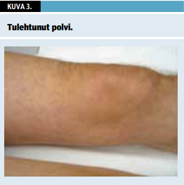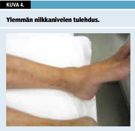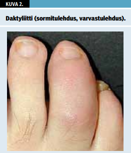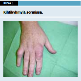 Potilasta pyydetään riisuutumaan, ja nivelten turvotus arvioidaan silmämääräisesti (kuvat 1-4 «»1 «»2 «»3 «»4) samoin kuin luiset paksuuntumat, mahdolliset virheasennot, arvet ja leikkausten jälkitilat. Palpoiden saadaan tietoa ihon lämpötilasta (kuva 1 «»1), nivelen turvotuksesta tai luiden poikkeavuuksista. Myös limapussien ja jännetuppien alueita sekä lihasten kiinnityskohtia tunnustellaan sormin. Niveltutkimusta tehtäessä kiinnitetään huomiota löydösten symmetrisyyteen ja laaja-alaisuuteen. Mahdolliset koko sormen tai varpaan turpoamiset havainnoidaan, ne ovat tyypillisiä spondylartriiteille, kuten reaktiiviselle niveltulehdukselle, selkärankareumalle tai psoriaasiniveltulehdukselle (kuva 2 «»2). Lihas-, silmä-, limakalvo- ja iho- sekä kynsimuutokset voivat olla viitteitä sidekudos- ja niveltulehdustaudeista (1-6). Ihonalaiset kihtikyhmyt kannattaa myös huomioida (kuva 5 «»5). Joissakin sidekudostaudeissa raajojen perifeerinen iho on pehmeästi tai kiinteästi turvonnut ja kynsivallit punoittavat. Valkosormisuus, sormien sinisyys tai pulssin puuttuminen herättävät epäilyn sidekudossairaudesta tai verisuonitulehduksesta (7).