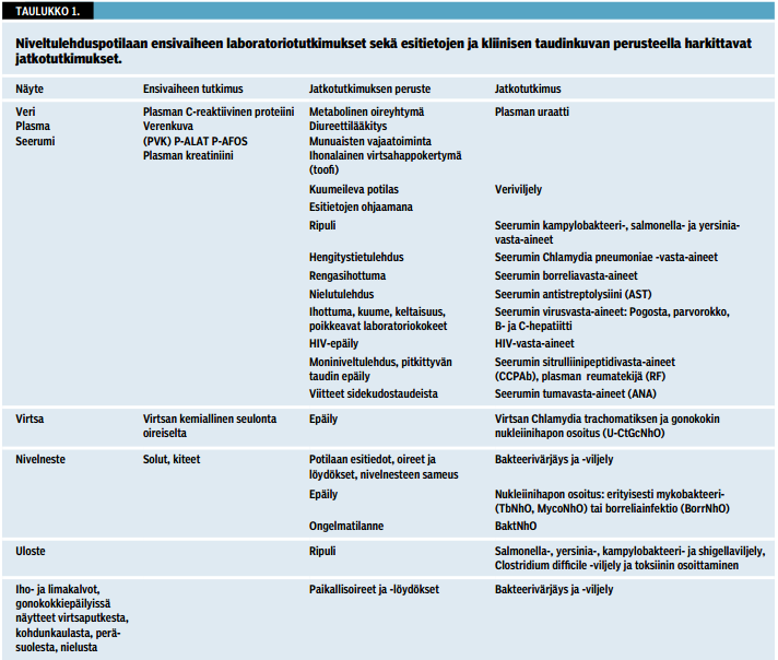 Laboratoriotutkimuksilla pyritään hakemaan näyttöä tulehduksesta, sen laukaisevista bakteereista tai viruksista. Tutkimuksilla etsitään myös poikkeavia immunologisia reaktioita tai tulehduksen aiheuttamia poikkeavuuksia elimistössä sekä arvioidaan laboratoriokoearvojen normaaliutta mahdollisia lääkityksiä varten (4,5,6). Näytteitä otetaan nivelnesteestä, verestä, virtsasta, ulosteesta ja joskus iholta sekä limakalvoilta (taulukko 1 «»6).
