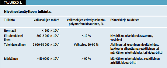 Näytteestä tutkitaan valko- ja punasolujen määrä, valkosolujen jakauma ja polarisaatiomikroskoopilla kiteiden esiintyminen. Valkosolujen määrän perustella voidaan arvioida niveltulehduksen astetta, mutta sen perusteella ei voida päätellä niveltulehduksen aiheuttajaa (taulukko 2 «»7). Bakteerin aiheuttamaa niveltulehdusta epäiltäessä nivelnesteestä on syytä tutkia bakteerivärjäys ja -viljely ja joissakin tapauksissa myös molekyyligeneettinen osoitus esimerkiksi tuberkuloosia tai borrelioosia epäiltäessä. Epäselvissä tilanteissa myös kohdistamattomasta bakteerin nukleiinihappo-osoituksesta voi olla hyötyä. Värjäykset ja viljely voidaan kohdistaa epäilyn perusteella myös harvinaisempiin taudinaiheuttajiin, kuten mykobakteereihin tai sieniin. Aiemmin todettua niveltulehdustautia sairastavan potilaan äkillisen niveltulehduksen ilmaantuessa on syytä muistaa komplikaation mahdollisuus. Toimenpiteet, kuten nivelinjektio tai tauti, johon liittyy immuunivastetta heikentävä lääkitys, altistavat bakteeritulehdukselle (8).