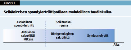 Aksiaalinen spondylartriitti muistuttaa taudinkuvaltaan alkavaa selkärankareumaa, mutta on kriteereiltään laveampi ja ilmiasultaan heterogeenisempi. Se voi sopia selkäoireisen potilaan diagnoosiksi silloin, kun selkärankareuman röntgenkuvaukseen perustuvat kriteerit eivät täyty (kuvio 1 «»1, taulukko 2 «»3). Varhaisen diagnoosin ansiosta tulehduksen spesifinen hoito voidaan tietyissä tapauksissa aloittaa jo sairauden alkuvaiheessa pysyvien tautimuutosten ehkäisemiseksi (5,6). Saksalaisessa kohortissa aksiaalisen spondylartriitin kriteerit täyttävistä potilaista 12 %:lla todettiin kahden vuoden kuluttua röntgenologisesti todennettu selkärankareuma (9).