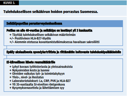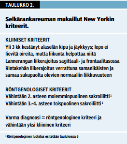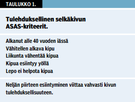 ASAS-työryhmä on esittänyt tulehduksellisen selkäkivun kriteereiksi viittä kivun alkamisajankohtaan ja -tapaan sekä luonteeseen liittyvää piirrettä (taulukko 1 «»2). Niistä vähintään neljä riittää täyttämään tulehduksellisen selkäkivun kriteerit (1).
