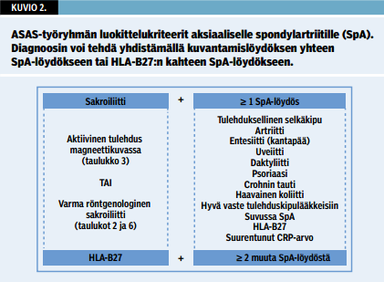Magneettikuvaus osoittaa sakroiliitin sekä rangan alueen akuutteja tulehdusmuutoksia, ja sen tulisi olla ensisijainen kuvantamismenetelmä alle 35-vuotiailla (14). Tutkimukset ovat osoittaneet varhaisten magneettikuvauslöydösten ennustavan röntgenologisesti myöhemmin todettavaa sakroiliittia (2,14,15). Aktiivisen sakroiliitin tunnistaminen magneettikuvauksella mahdollistaa aksiaalisen spondylartriitin diagnosoimisen vuonna 2009 laadittujen luokittelukriteerien mukaisesti (kuvio 2 «»4). Suomalaisessa väestössä HLA-B27-kudostyyppi on poikkeuksellisen yleinen (esiintyvyys n. 15 %), ja siksi Suomessa diagnoosi liitetään tyypilliseen kliiniseen kuvaan ja oireistoon sekä kuvantamislöydökseen. HLA-B27-tekijä tukee diagnoosia, mutta on muistettava, että vain 1-6 %:lle HLA-B27-positiivisista ihmisistä kehittyy spondylartriitti (4).