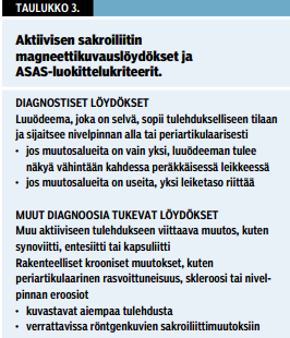 Sakroiliitin diagnosoiminen magneettikuvauksella edellyttää ASAS-työryhmän kriteerien mukaisesti selkeää tulehdukseen sopivaa luuödeemaa, jonka sijainti on tyypillisesti SI-nivelen keski- ja alaosissa (2,14) (taulukko 3 «»5). Muut tulehdukselliset muutokset, kuten synoviitti, voivat olla merkittäviä, mutta niitä esiintyy harvoin ilman muita löydöksiä eivätkä ne yksistään riitä diagnoosiin. Aiempaa tulehdusta kuvastavat rakenteelliset muutokset ovat verrattavissa röntgenkuvassa näkyviin muutoksiin, eivätkä ne riitä aktiivisen sakroiliitin diagnoosiin ilman luuödeemaa mutta tukevat sitä.