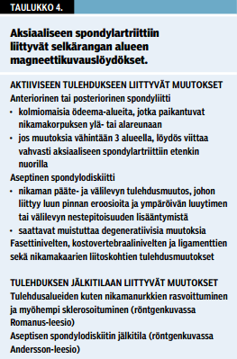 Magneettikuvaus on huomattavasti tavallista röntgenkuvaa hyödyllisempi myös selkärangan alueen aktiivisten muutosten tunnistamisessa (7). Tyypillisiä tulehdusta kuvastavia muutoksia ovat kolmiomaiset nikamakorpusten etu- tai takanurkan ödeema-alueet sekä aseptiset spondylodiskiittimuutokset, jotka kroonistuessaan muuttuvat rasvamuutoksiksi (taulukko 4 «»6). Rangan alueen löydöksiä ei huomioida ainakaan vielä aksiaalisen spondylartriitin diagnoosikriteereissä, mutta niistä on laadittu diagnostiikkaa tukeva konsensuspäätös (taulukko 4 «»6) (7).