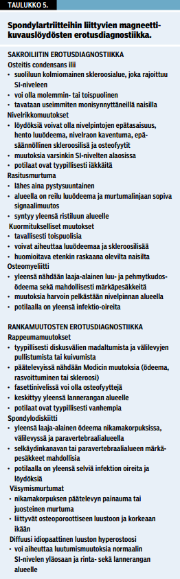 Spondylartriittimuutoksia muistuttavia magneettikuvauslöydöksiä voidaan havaita muissakin sairaustiloissa, joskin taudinkuva on tällöin yleensä erilainen. Tärkeimmät magneettikuvan tulkintaan liittyvät erotusdiagnostiset vaihtoehdot on esitetty taulukossa 5 «»7 (11,12).
