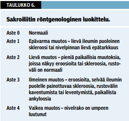 Spondylartriittien aiheuttamat vauriot kehittyvät hitaasti, usein vuosien kuluessa, tavallisissa röntgenkuvissa erottuviksi muutoksiksi (13,14). Sakroiliittia kuvaavat risti-suoliluunivelmuutokset kehittyvät yleensä ensin ja ne voidaan luokitella viiteen eri asteeseen (taulukko 6 «»8). Selkärangassa voidaan nähdä aluksi nikamien neliöitymistä ja myöhemmin nikamanurkkien eroosiota sekä skleroosia. Taudin edetessä alkaa kehittyä syndesmofyyttejä, ja vertikaalisuuntaan kasvavia luusankoja, jotka voivat muodostaa nikamien välille luusiltoja. Muutokset kehittyvät yleensä ensin rinta- sekä lannerangan ylimenoalueelle mutta niitä voi vähitellen ilmetä koko selkärangan alueelle. Myös fasettinivelissä ja okahaarakkeissa voi esiintyä luutumista. Pitkälle edenneessä taudissa voidaan todeta rangan täydellinen luutuminen ns. bamburangaksi.