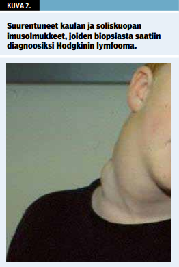 Kaikki imusolmukealueet (kaula ja niska, soliskuopat, kainalot, nivusalueet) palpoidaan. Soliskuopan imusolmukesuurentuma vaatii aina lisätutkimuksia (kuva 2 «»2). Poikkeavien imusolmukkeiden koko, aristus, punoitus, alustaan kiinnittyminen ja kiinteys tai fluktuaatio arvioidaan. Yleisstatuksessa haetaan infektiofokuksia erityisesti nielusta ja muualta hengitysteistä sekä iholta (päänahasta). Pään ja kaulan liikkeet ja suun aukeaminen tarkastetaan. Maksan ja pernan koko palpoidaan ja niveltilanne tarkistetaan.
