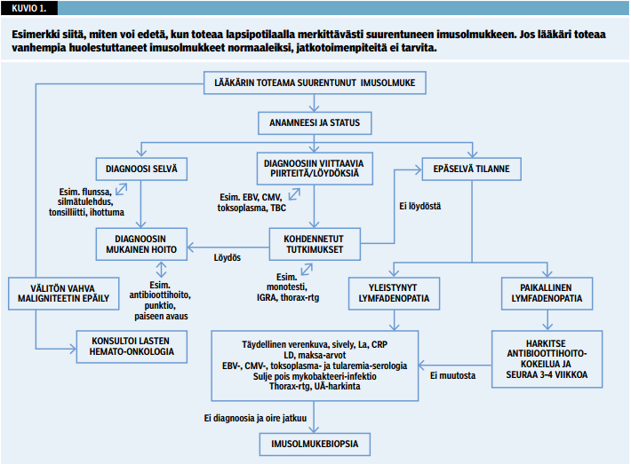 Pitkittyneessä tilanteessa (imusolmuke pysyy ennallaan 3-4 viikon seurannassa) täydellisen verenkuvan ja laskon sekä laktaattidehydrogenaasin tutkiminen auttavat infektion ja hematologisen maligniteetin diagnostiikassa. Mikrobietiologian serologiset tutkimukset (EBV-, CMV-, F. tularensis- ja toksoplasmavasta-aineet, Monotest ja tuberkuloosiepäilyssä IGRA) ovat hyödyllisiä (kuvio 1 «»3).