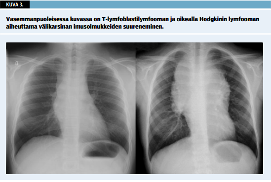 Jos maligniteettia ei ole suljettu pois tai on syytä selvitellä muiden yleissairauksien mahdollisuutta, ovat imusolmukealueen ja vatsan kaikututkimukset sekä thoraxkuvaus aiheellisia (kuva 3 «»4). Kaikututkimuksessa pahanlaatuiseen muutokseen voi viitata imusolmukkeen normaalirakenteen häiriintyminen (suuri, pyöreä, niukkakaikuinen, rasvanidus puuttuu). Toisaalta kaikututkimus voi osoittaa muutoksen paiseeksi tai kystaksi. Keuhkojen alueelta voi löytyä hilusten tai laajemmin välikarsinan imusolmukkeiden suurentuminen, joiden perusteella erotusdiagnostiikka etenee joko lymfooman ja maligniteetin tai infektion suuntaan.