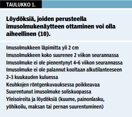 Maligniteetin suhteen selvästi epäilyttävä imusolmuke on syytä poistaa kokonaisuudessaan näytteeksi (taulukko 1 «»5). Tuolloin näytteenotosta tulee konsultoida hemato-onkologia, jotta kaikki tarvittavat näytteet tulevat otetuiksi ja tutkituiksi. Jos maligniteettia ei epäillä, voidaan ottaa ohutneulanäyte, josta saadaan sytologinen tutkimus ja bakteerien sekä mykobakteerien värjäys ja viljely.